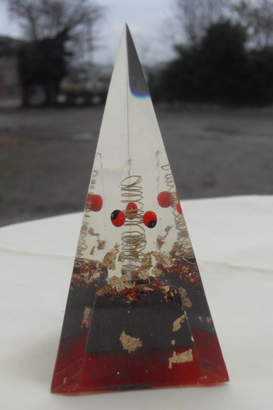Le générateur de l’élément Feu représentant Mars est un tétrahèdre. Sa base est rouge, composée de micro poudre de fer et de jaspe rouge ainsi qu’une pointe de cristal laser enroulé de cuivre.