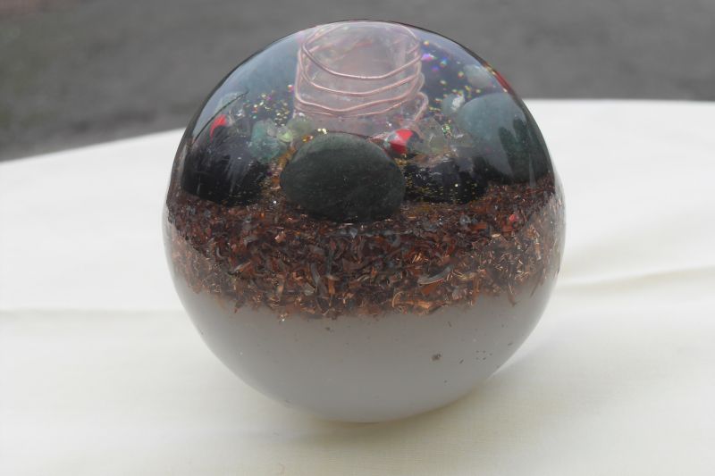 Générateur de l’élément Métal en forme de sphère liée à Vénus, la base est blanche irisée, la masse d’Orgonite est composée de cuivre surmontée d’émeraudes, aventurine et shungite, au centre se trouve une pointe de cristal laser entourée de cuivre.