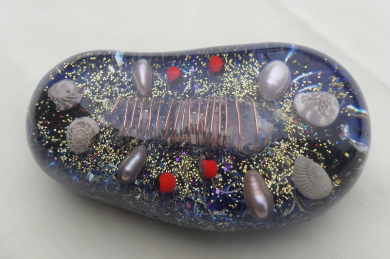Générateur de l’élément Eau lié à Mercure en forme arrondie. La base est bleue, la masse d’Orgonite composée de copeaux d’argent est surmontée de perles baroques et de coquillages entourant une pointe de cristal laser dans une spirale de cuivre.